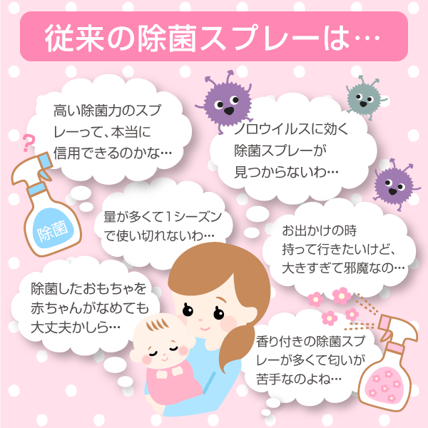 どちらの菌も予防・感染を抑えるにはチャーミストが有効です! 赤ちゃんが舐めても安心な成分のチャーミストは、 手だけでなく食器やおもちゃの除菌に最適♪